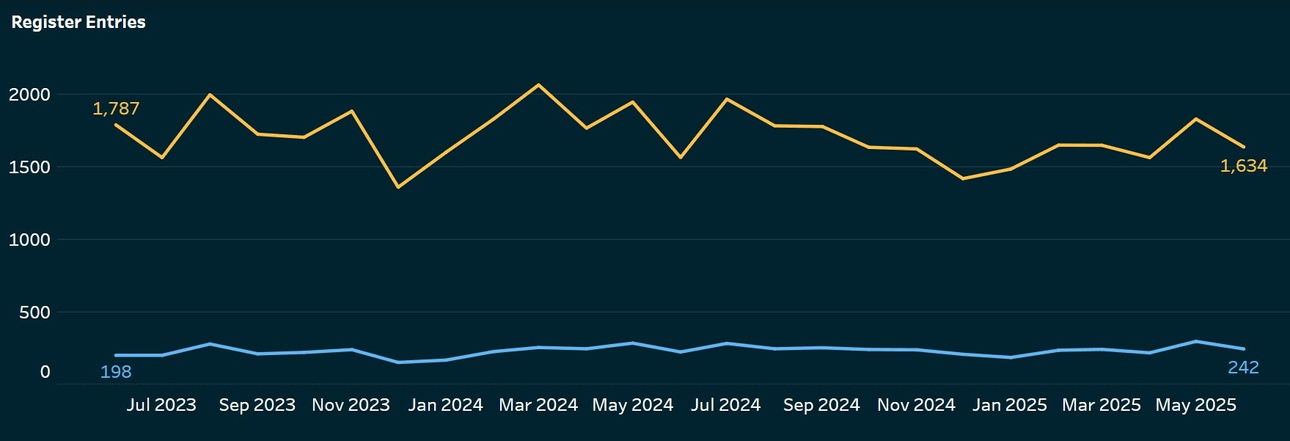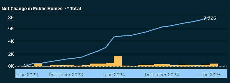 New people continue to enter the waitlist every day, but the total size of the list has shrunk roughly a quarter between June 2023 and June 2025, from 24,716 to 19,115. This is mostly explained through an increase in public housing supply, as Kāinga Ora has completed some large-scale new builds. July 2024 set a recent monthly record, with 1,635 new homes coming online.
