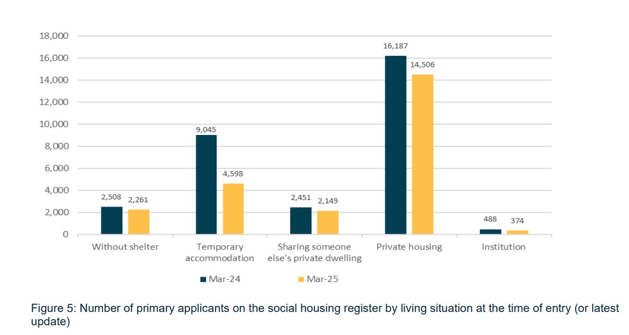The impact of this policy can be seen in the data. The number of people on the waitlist living in “temporary accommodation” (which includes emergency housing) has halved between March 2024 and March 2025.