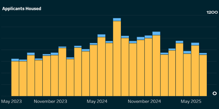 Since June 2023, 21,224 applicants have been housed from the social housing waitlist. The trend line shows a general monthly increase, with a particular spike in July 2024, when 1,298 people were placed into homes.