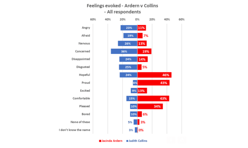 Specifically, almost twice as many people said Ardern made them feel hopeful compared with Collins – 46% to 24%.