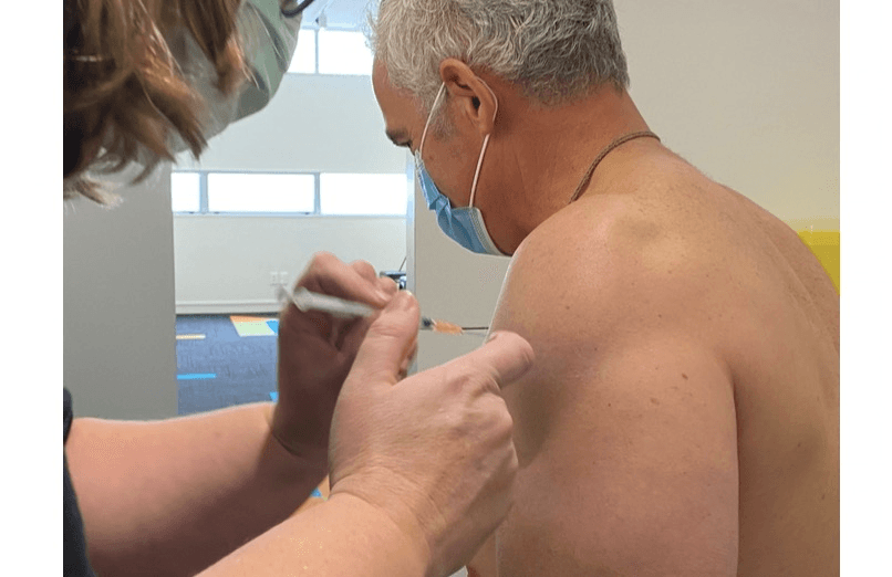 But what does that have to do with him being shirtless at a vax centre?
