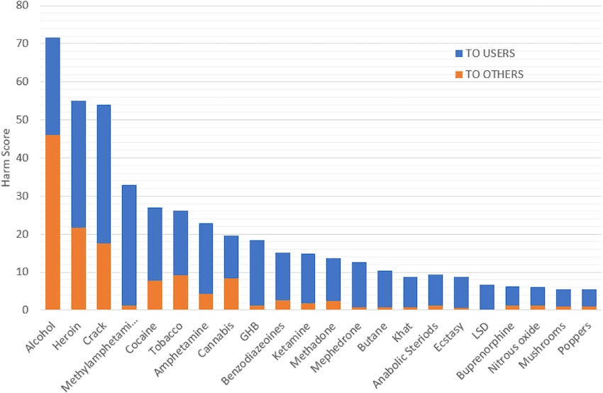 But as is obvious to anyone who’s been out on the town or is familiar with the effects of each substance, alcohol is far more harmful than cannabis. The science on this is clear too. Here’s a nice graph from a recent paper looking at the harms of poppers and nangs that, helpfully, included lots of other drugs.