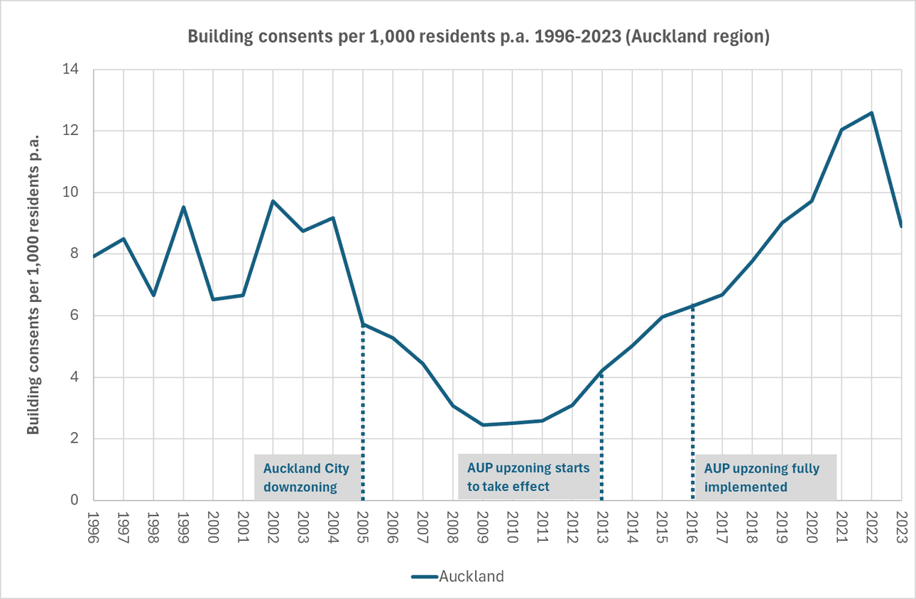 The number of building consents issued per 1,000 people annually fell after downzoning in 2005 and remained low until the Auckland Unitary Plan began to be adopted from 2013 onwards – after which consents surged to all-time highs.