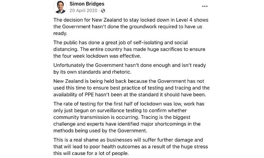 But in April 2020, as Covid-19 continued to dominate the political landscape, a simple Facebook post threatened to end Bridges’ leadership immediately. The post criticised the government for keeping New Zealand in alert level four and looked to Australia as an exemplar to follow.