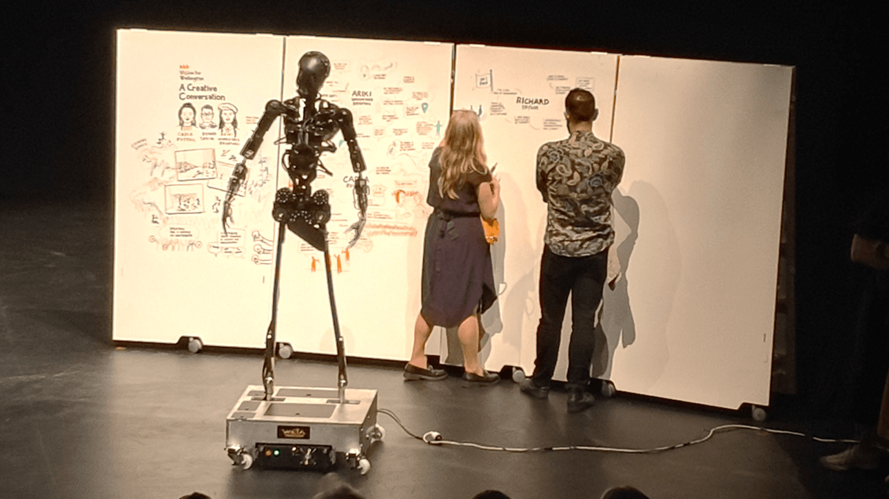 The three panellists were impressive. Muralist and sculptor Ariki Whakataka Brightwell presented some of her pieces and discussed the challenges of finding workshop spaces. NZ Art Show director Carla Russell highlighted the importance of finding profitable models and working with the business sector. Wētā Workshop founder Richard Taylor brought out the Wētābot005, a Terminator-esque robot that was both awe-inspiring and terrifying. It remained on stage for most of the event, subtly lifting its arms and chest every few seconds as if it were breathing.