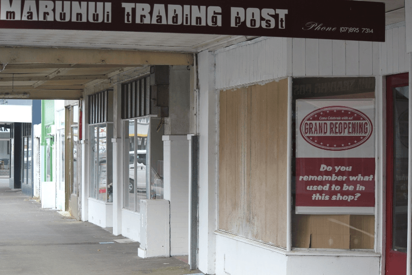 Many people driving in from State Highway Four see only the petrol station and the supermarket next to the motorway, before heading on down the Forgotten Highway. Further into the town there’s a main street with free wifi for the tourists around the bus terminal, a handful of cafes and a lovely Thai restaurant. A few of the shops are thriving, more look like they’re struggling. On Manuaute St, towards the rugby field, the youth council ran a competition to design and install fake storefronts on abandoned buildings to enliven the area. That was a few years ago, and most of them are still there.