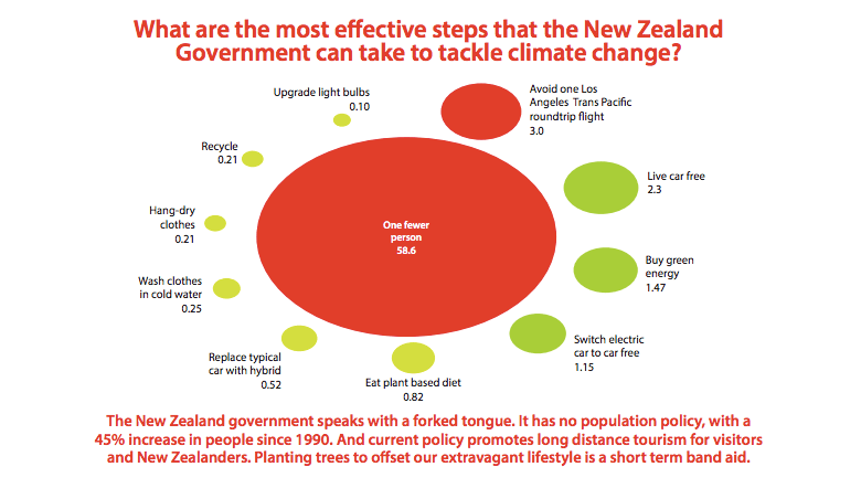 They accuse the government of “speaking with a forked tongue,” because of a lack of population policy. And they hit out at other high emissions industries, saying “current policy promotes long distance tourism for visitors and New Zealanders. Planting trees to offset our extravagant lifestyle is a short term band aid.” It’s the sort of talk – were it coming from an environmental group – that would get them accused of eco-fascism. The author of the pamphlet could not be reached for comment about what mechanisms would be used in such a population policy.