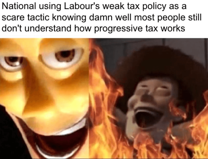It’s always a good time to remind everyone how progressive tax works. Each bracket is for earnings over the stated amount. If you earn less than $14,000 in a financial year, you will pay 10.5% tax on whatever you earn. If you earn $20,000 in a year you will pay 10.5% on $14,000 and 17.5% (the next tax bracket) on the remaining $6,000. You will not pay the higher tax bracket on everything, only earnings that are within that bracket. In other words, an increase in a particular tax bracket will not affect the tax on your total earnings. Here’s an example: under Labour’s big mighty tax plan, someone earning $185,000 (aka a lot) will pay an extra $300 in tax (aka not a lot). Tax is scary but it’s also the most weaponised tool in political campaigning. If someone you know has forgotten how progressive tax works, remind them!