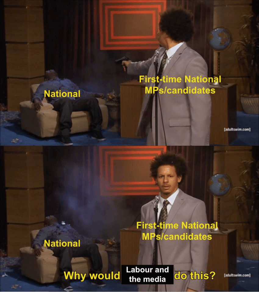 Bezzant joins first-and-probably-last-term MP Hamish Walker (private Covid-19 data leak), first-and-definitely-last-term MP Andrew Falloon (sexually explicit photos sent to young women) and fellow first-time candidate William Wood (photo of him impersonating Hitler was found online). If I can find your loser ex online within six minutes of you mentioning him by first name only, then National can surely background check their new candidates better.