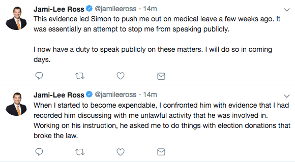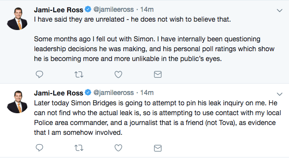In a series of four tweets, National MP Jami-Lee Ross has detonated a bomb under the leadership of Simon Bridges. Just a few minutes before the National leader began a media conference announcing results of the inquiry into his expenses leak, Ross accused his party leader of directing him to break the law, saying Bridges was about to unfairly pin the leak on him.