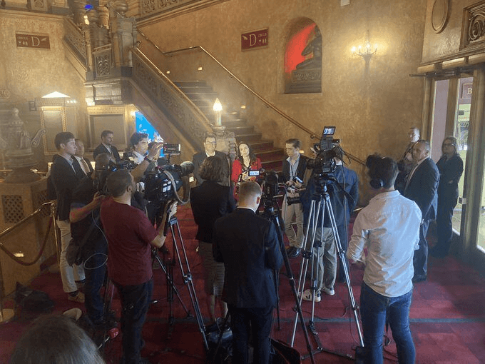 Afterwards, the PM met the cast, regaled with tales of their schedule – as with most productions there’s a rotating cast for the major role – and posed for a photo. She leaned over the orchestra pit, and expressed worry that the safety net wouldn’t necessarily catch someone falling but might just break their fall. Definitely more of a concern in a show like Mary Poppins than most.
