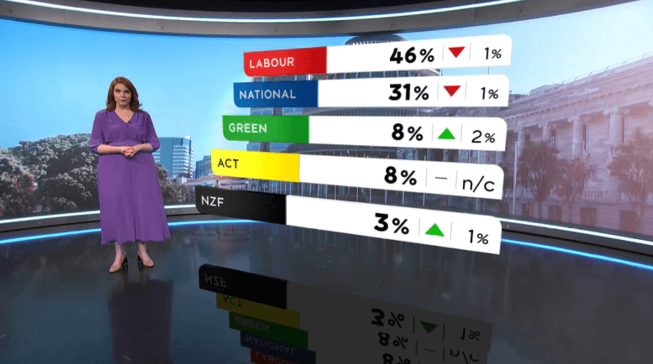 A new TVNZ/Colmar Brunton poll put Labour at 46%, and the Greens jumping 2 points to 8%