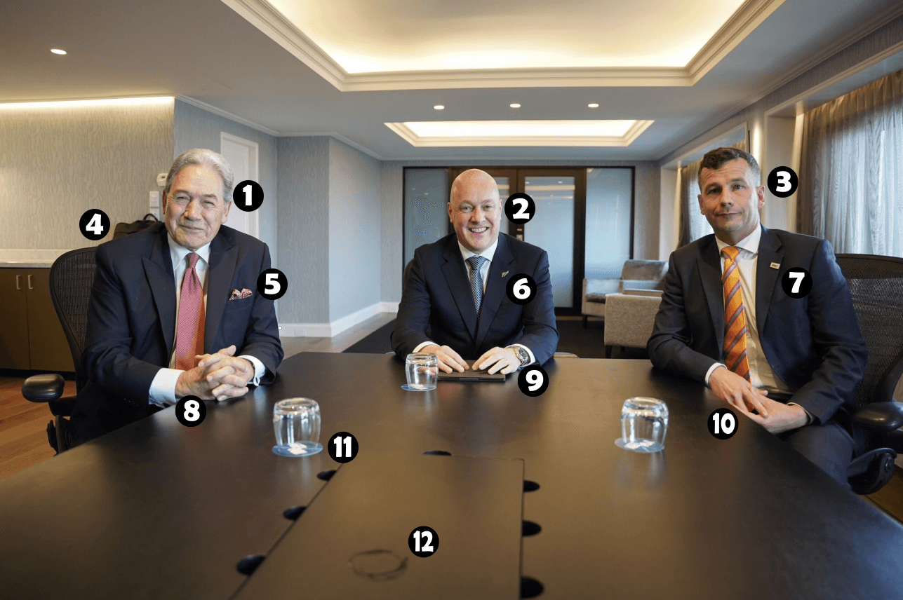 11. The glasses are bottom up, unused, propped on their coasters, suggesting that in the cause of putting together a strong and stable government for the people of New Zealand there was no time for niceties such as hydration. Either that or the whole thing was cursory and emblematic and just for the photo.