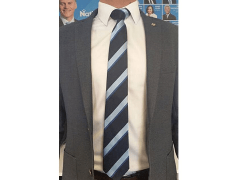 Fifty bucks is a lot for a tie, but this one is “sporting a discreet logo”, and if the image is a guide it will provide the most alpha chest puff imaginable and Bill English will land like an angel on your shoulder, whispering sensible advice and moody haiku in your ear for the rest of your days.