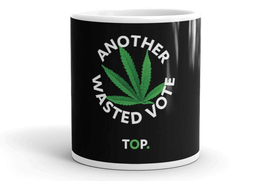 A mug from the Opportunities Party. In the middle there is a cannabis leaf, so it may be a reference to the cannabis legalisation referendum, which it pre-dates. But also there’s a play on words there. “Wasted vote” appears to acknowledge the haters’ suggestion that a vote for TOP is wasted – and, well, they did get 1.5% last election, well below the 5% threshold. But, wait: “wasted” is edgy slang for being heavily intoxicated, so, well, I don’t know. Also TOP is POT backwards so really makes you think.