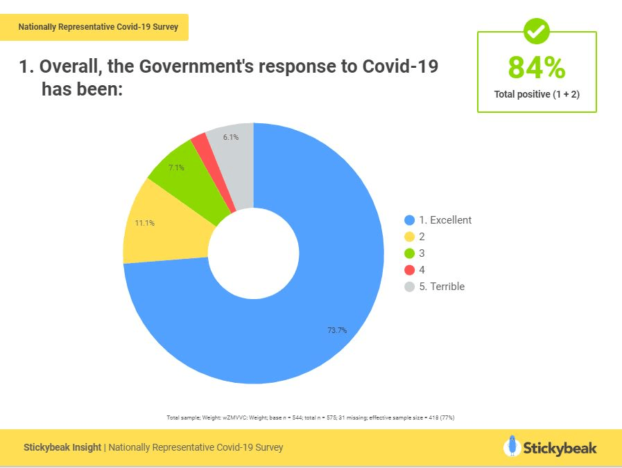The first Stickybeak Covid-response survey, conducted immediately following Jacinda Ardern’s announcement of a move into lockdown on March 23, showed 80% support for the response. The four times we’ve asked the question since, that number has been higher, respectively: 83%, 86%, 84% and again, as we report today, 84%.