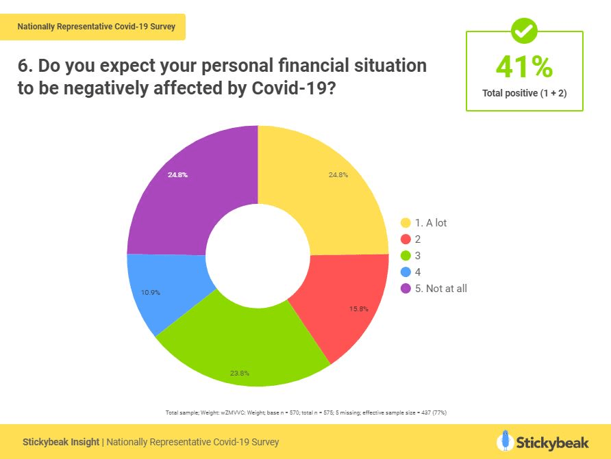 The new poll shows 41% expecting their personal financial situation to be negatively affected by Covid-19. That’s a drop from the last poll a month ago, which found 51% anticipating such an impact.