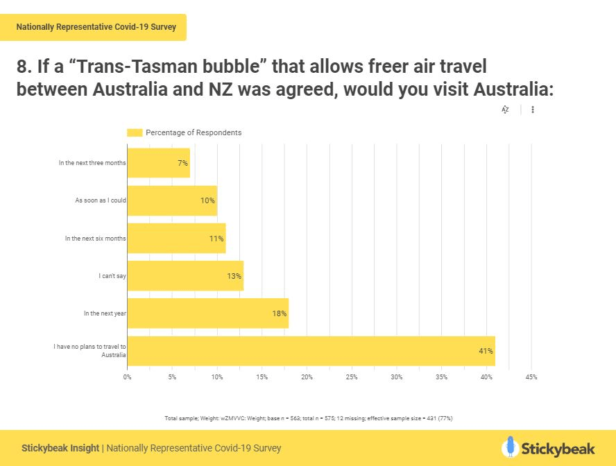 When it comes to the prospect of a “trans-Tasman bubble”, which would allow travel between New Zealand and Australia without the requirement to quarantine, a majority were keen to hop across the ditch, with 59% saying they’d visit within the next year.