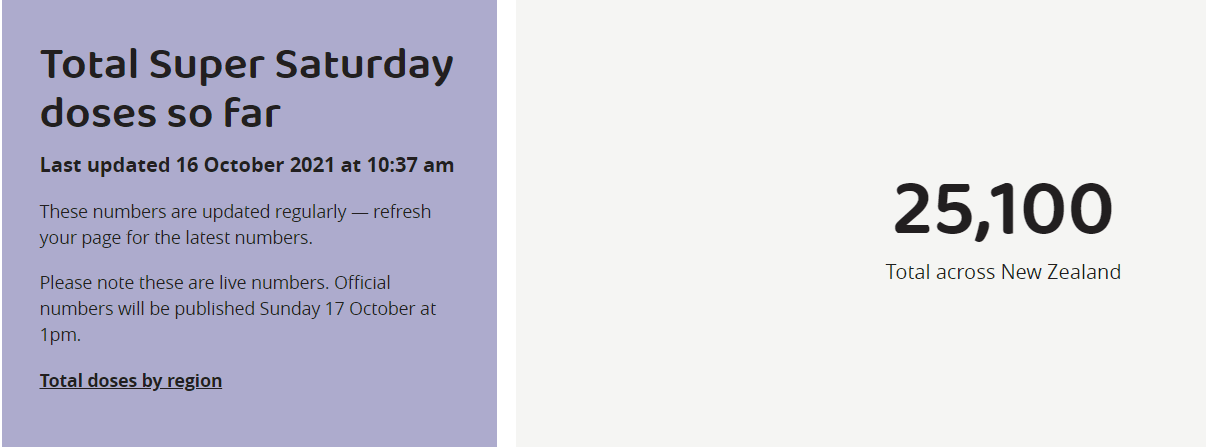 It’s only mid morning, and New Zealand is already quarter of the way to its Super Saturday target of 100,000 doses administered.