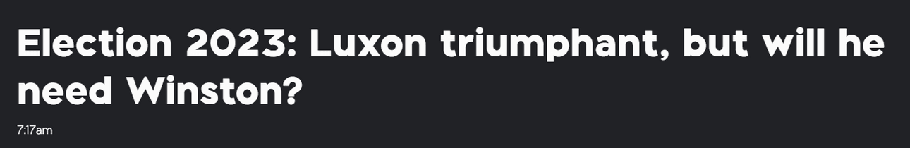 When Simon Bridges ruled Peters out as a potential coalition partner back in 2020, National’s Chris Bishop tweeted: “Simon Bridges has ruled out Winston Peters because he doesn’t trust him and NZ First. Leadership.” Bishop has so far failed to condemn Chris Luxon’s lack of leadership. Perhaps it will come up in what will no doubt be a convivial first Cabinet meeting