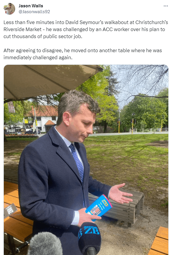 By the end of the campaign, Seymour had taken to wandering the streets, trying to find someone, anyone who’d been ram raided or robbed. In Christchurch he fronted a media conference next to someone holding a sign saying “David Seymour is a f****** idiot“. He wandered off into a market where he was harangued by a worker over his plans to implement punitive public sector cuts. It seemed everywhere he trudged, Winston Peters was there, a haunting grin glued to his face, cackling and reaching down to steal yet more Act votes.