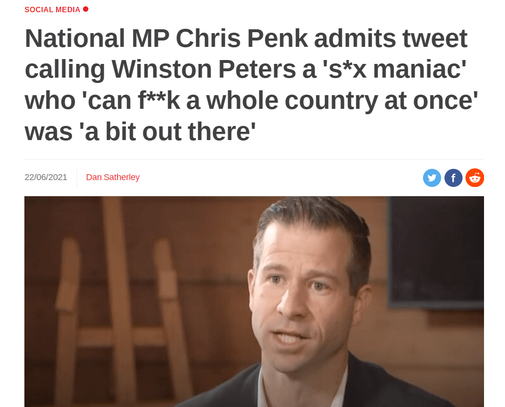 Peters once said National is full of sex maniacs. In reply, National’s Helensville MP Chris Penk tweeted: “Winston Peters is the real s*x maniac because he can f*** a whole country at once”.