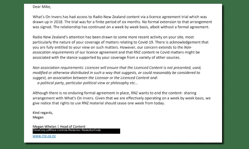The email continued: “Although there is no enduring formal agreement in place, RNZ wants to end the content- sharing arrangement with What’s On Invers.”