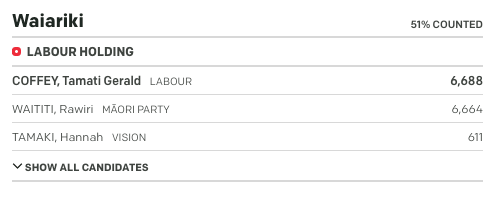 Waiariki: On 4% of the vote counted, Labour’s Tāmati Coffey has a 41 vote lead over the Māori Party’s Rāwiri Waititi – this is one of the best chances for a Māori Party pickup.
