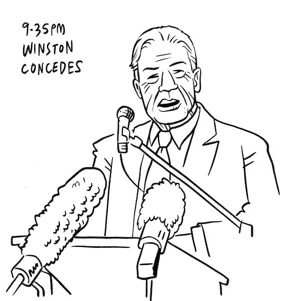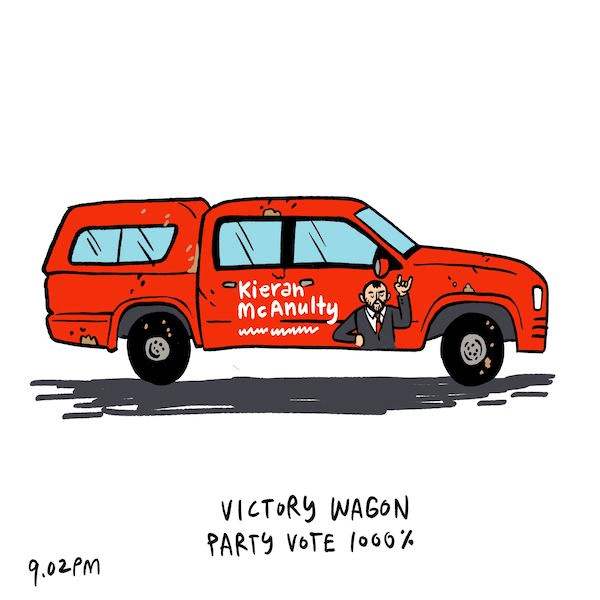 The clock has struck seven so the floodgates are open. We’ve got Spinoff writers heavily caffeinated at their desks here in out Auckland office and at party functions across the city. We’ll have dispatches flowing in through the night, as well as video and original artwork from the inimitable Toby Morris.