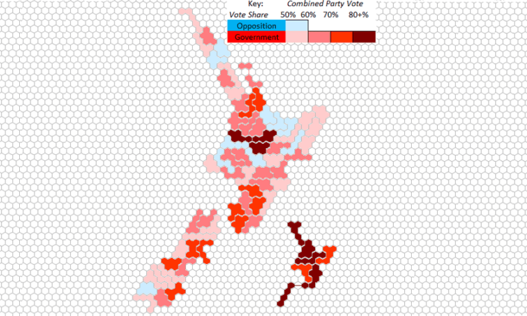 Electoral results maps can often be deceiving, over-emphasising large but sparsely populated rural areas and under-emphasising densely populated ones. So policy analyst Stephen Beban has created the hexamap by breaking down the map into small, coloured hexagons., thereby giving a more accurate representation.