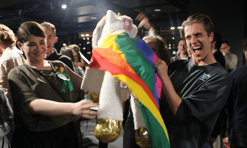 Menéndez March – Maungakiekie candidate and a harbinger of the dreaded wealth tax – is now officially in parliament, and the crowd went wild when they heard it. No campaigning was allowed on election day, which he said was like a weight lifted off his shoulders. Earlier in the evening he’d dismissed the slightly more positive polls of Friday night. “It’s like your ex calling you at 2am,” he said. It doesn’t really mean they love you.