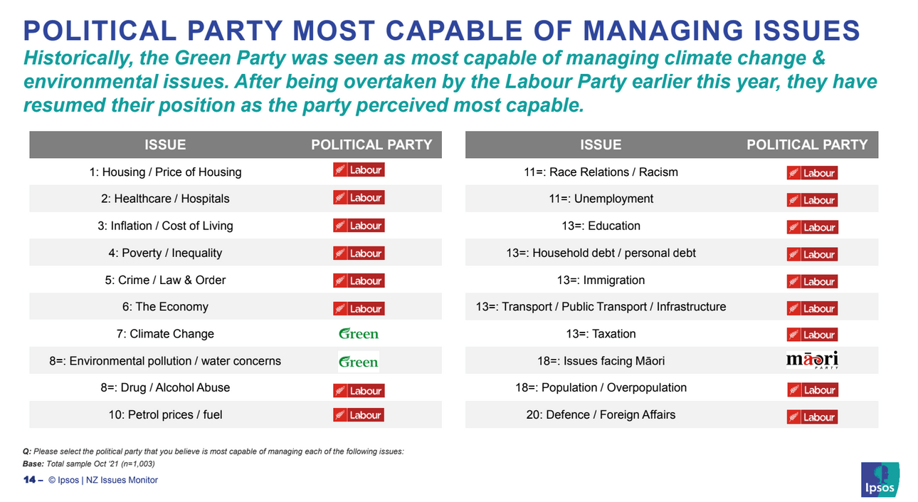 The latest Ipsos report revealed that of the biggest issues facing New Zealanders, Labour was seen as “most capable” of managing 17 of them. The Greens and the Māori Party grab the remaining three issues – all of which are areas specifically targeted by the parties. National and Act don’t feature at all, with issues traditionally associated with them – such as the economy – taken by Labour.