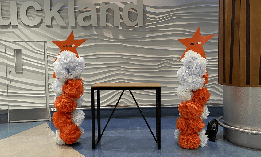 Jetstar is definitely pulling out all the stops for the first arrivals this afternoon. I count at least seven large orange pom poms. There is also a laptop hooked up to some speakers blaring a playlist titled: Kia Ora New Zealand. So far it’s mainly been Benee.
