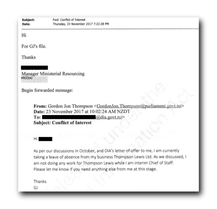 An official information request for any communications between Thompson and Ministerial Services about conflicts of interest show that over a month into the job Thompson wrote to his manager restating his interest in the firm in general terms.