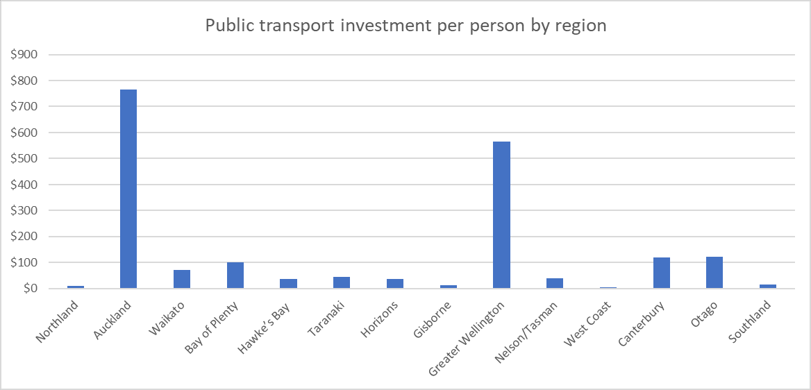 A big change in public transport funding around this time saw the concentration of investment in main centres. Today, the differences in how much funding public transport in your area gets per person, depending on where you live, are extreme: