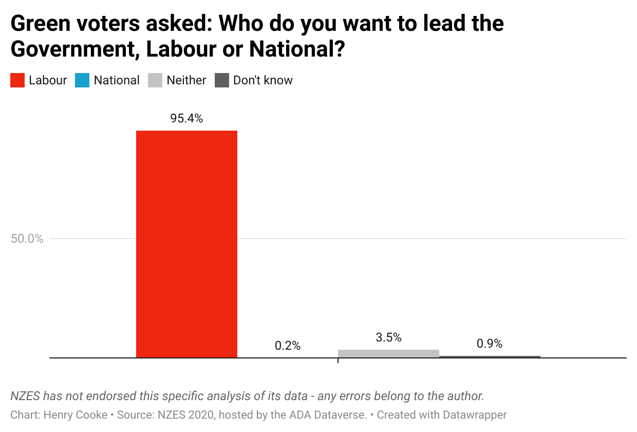 Asked specifically who they would prefer to be in government, Labour or National, 95.4% of Green Party voters say Labour, compared to 0.2% who say National.