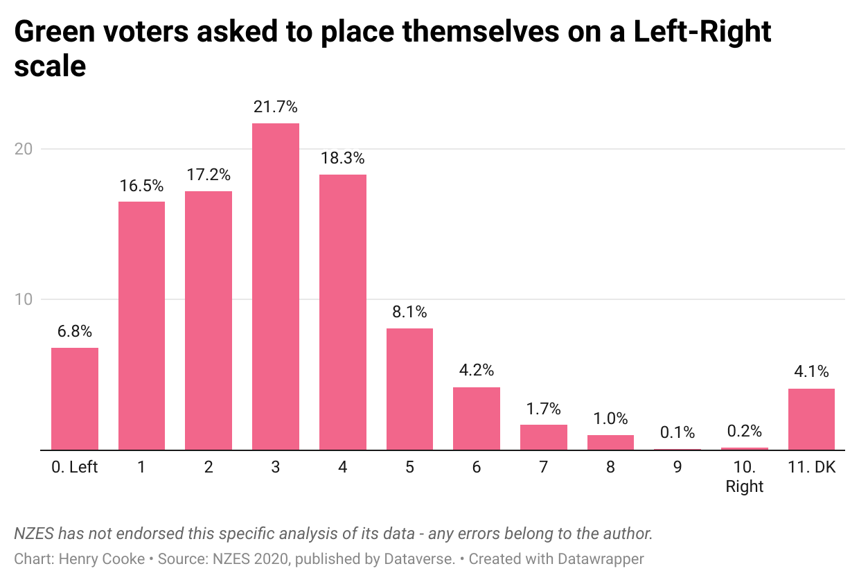The Green Party’s current voters do not see themselves as centrist pragmatists committed to finding the best deal from the two main parties. If you ask them to rate themselves on a left-right scale, as the New Zealand Election Study did in 2020, 80.5% of those who party voted Green place themselves broadly on the left, compared to 7.2% who place themselves on the right.