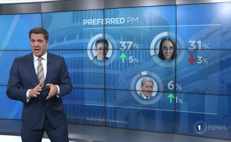 So how’s that going for him? Bloody well, if tonight’s Colmar Brunton poll for 1News – its last before the election – is to be believed. The National Party has leapfrogged their rivals since the last poll for 1News, turning a four-point deficit into an amazing nine-point lead. And NZ First is seriously, seriously struggling, down to 5%, the threshold required without an electorate win, with Winston Peters far from guaranteed to retain Northland. Down to 5%, but still a critical 5%, which National would require on these numbers to form a government.