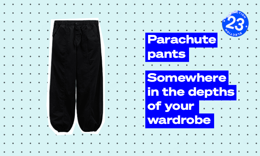 Ngarewa-Packer said she’s had these parachute pants for years, which is interesting because until the last year or so they hadn’t been available to buy in shops for ages. My grandmother would be very proud of her for holding onto them until fashion circled back around – they’re perfectly gorpcore, and obviously capturing the 90s and 00s renaissance. I’m going to assume most of us have grown a few centimetres up or out since the turn of the millennium, so we need to go shopping. If you’re looking for your pants to protect your legs from the biting wind, try aimn’s windbreaker parachute ones for $145. If your tween years didn’t ruin Supré for you, they have some with nice toggles for $69.