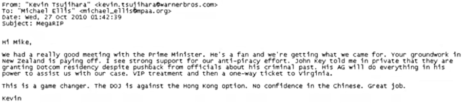 The email was published in an online report by Fisher. Purported to be a message from Warner Bros CEO Kevin Tsujihara to the Motion Picture Association of America’s Michael Ellis, it was headed “MegaRIP” and dated October 27, 2010. At the time, Immigration NZ was assessing Dotcom’s residency application.