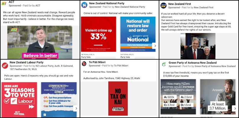 Pages supporting the current government tended to focus only on specific policies, or overall concepts: Leading the Charge is an electric car lobby group that focused on not removing the clean car discount – it also ran a billboard campaign. Save Animals From Exploitation focused on live animal exports, which had been stopped by the Labour government. The NZCTU highlighted the role of Fair Pay Agreements, while activist group ActionStation promoted its Triple the Vote project. Right-wing group Hobson’s Pledge also ran a second page called We Belong Aotearoa, which had more explicit messaging around race. In general, much of this political advertising was focused only on specific policies, like the Clean Car Discount. Many of the third party advertisers, unlike the political parties and candidates, had very few followers on their Facebook and Instagram pages, so needed to pay for advertising to make people see their messages.