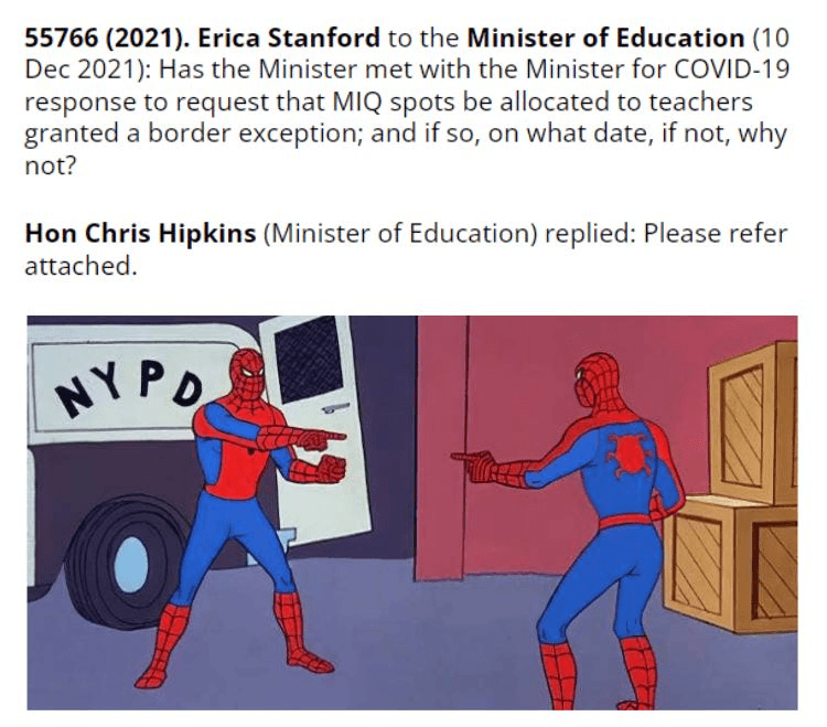 Hipkins is also possibly the minister of memes: at a press conference as the minister for the covid-19 response, Hipkins advised those in lockdown to get out and “spread their legs” which was fodder for the bored, at home on the internet demographic, and also international outlets looking for quirky New Zealand stories. He was also possibly the first member of parliament ever to respond to a written question with a meme.