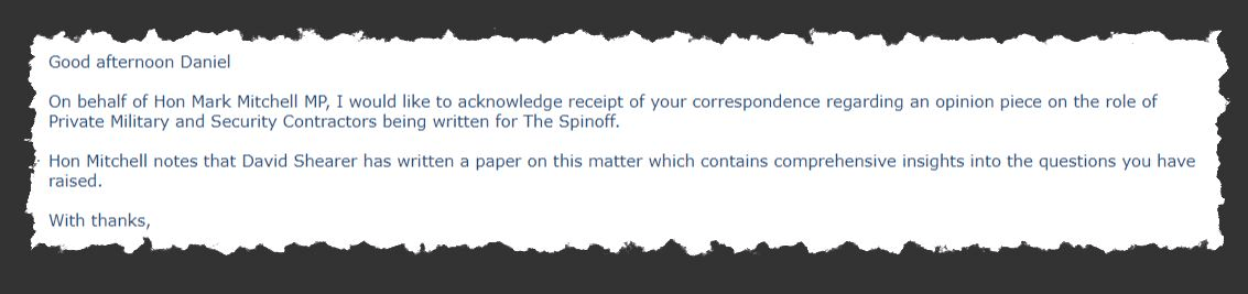 During an appearance on the AM Show yesterday, Mitchell said that after a stint with the police, he headed “overseas, formed my own company, which I was very proud of. I became chairman and CEO of that. And then came home and wanted to get back into public service and then ran for parliament.” So just where was this “overseas”? And what was this company? Overseas was Iraq, and Mitchell’s company provided private military and security services. Mitchell’s period away from public service saw him build a multimillion-dollar business in a highly lucrative and globally competitive commodity – war.