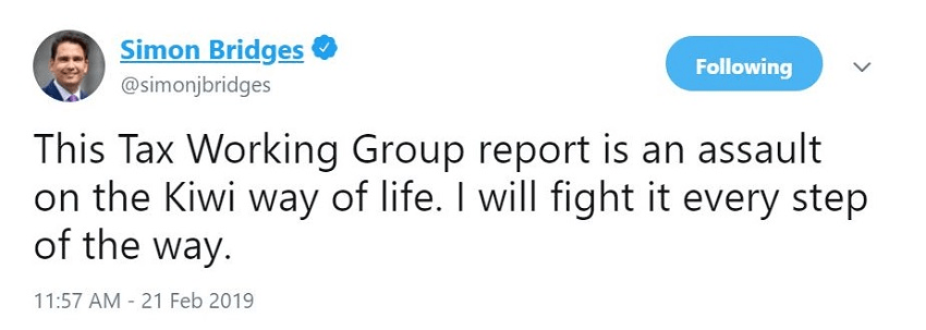 The ink had barely dried on the Tax Working Group report and Simon Bridges was already declaring war. It had recommended a capital gains tax on investment properties and income from shares, offset by an income tax cut for working New Zealanders. That was an atrocity in Bridges’ mind. “This Tax Working Group report is an assault on the Kiwi way of life,” his minders presumably typed as he sweatily clambered into some Winston Churchill LARP gear. “I will fight it every step of the way.”