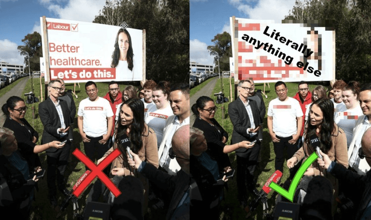 All parties will be sending their minions out late Friday night to take down every last vandalised hoarding. The implication is that if you drive to a voting booth and see Winston Peters’ face on the way, you’ll vote for Winston Peters. The implication is that we’re all idiots and if you see a hoarding while out and about on Saturday you should call the police.