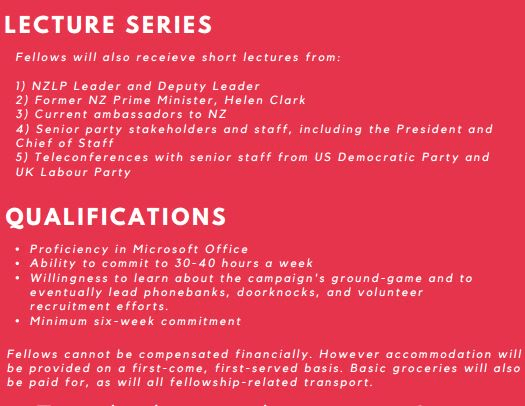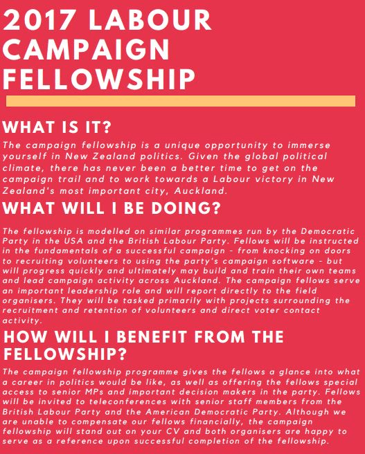 Any attempt to say this is not an issue for the Labour Party, and that the Campaign for Change is a separate, non-aligned group, is too cute by half. Matt McCarten was at the heart of Labour strategy until a few weeks ago, as head of Auckland campaigning, and before that as chief of staff to the leader. In a statement today he acknowledged that “a number of [the interns] did volunteer to help with Labour campaigns in Auckland”. OK, but even if you accept that the operation split off from the party back in May, a glance at the promotional material – posted at universities everywhere from Michigan and Illinois to the Netherlands – looks just a little bit Laboury (full flyer at foot of article).