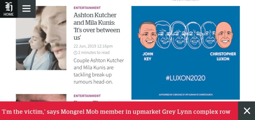 The ad also features the hashtags #Luxon2020 and #National2020, which seemingly promotes supporting Luxon and National in next year’s general election. Below that is an authorisation statement by ‘S Brooks of 299 Durham Street Christchurch’.