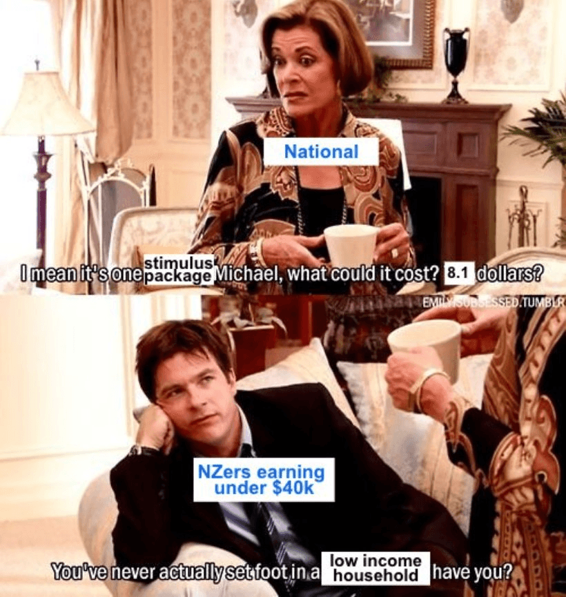 National announced its big tax plan on Sunday and promised tax cuts for most New Zealanders. National’s finance spokesperson Paul Goldsmith said the temporary (they will only be in effect for 18 months) tax cuts would be a “stimulus”, meaning the money would likely end up back in the economy. Stimulating the economy is nice, and the people with the least money are the ones most likely to spend a cash boost (think of someone saving for shoes/clothes/appliances suddenly being able to buy them). Unfortunately National’s tax cuts won’t be the most effective economic stimulus because they’ll be giving minimum wage earners a whopping *triple checks notes* $8.10 per week. Meanwhile, those earning $90k per year (and therefore less in need of immediate cash to spend) will get an extra $58.10 per week.