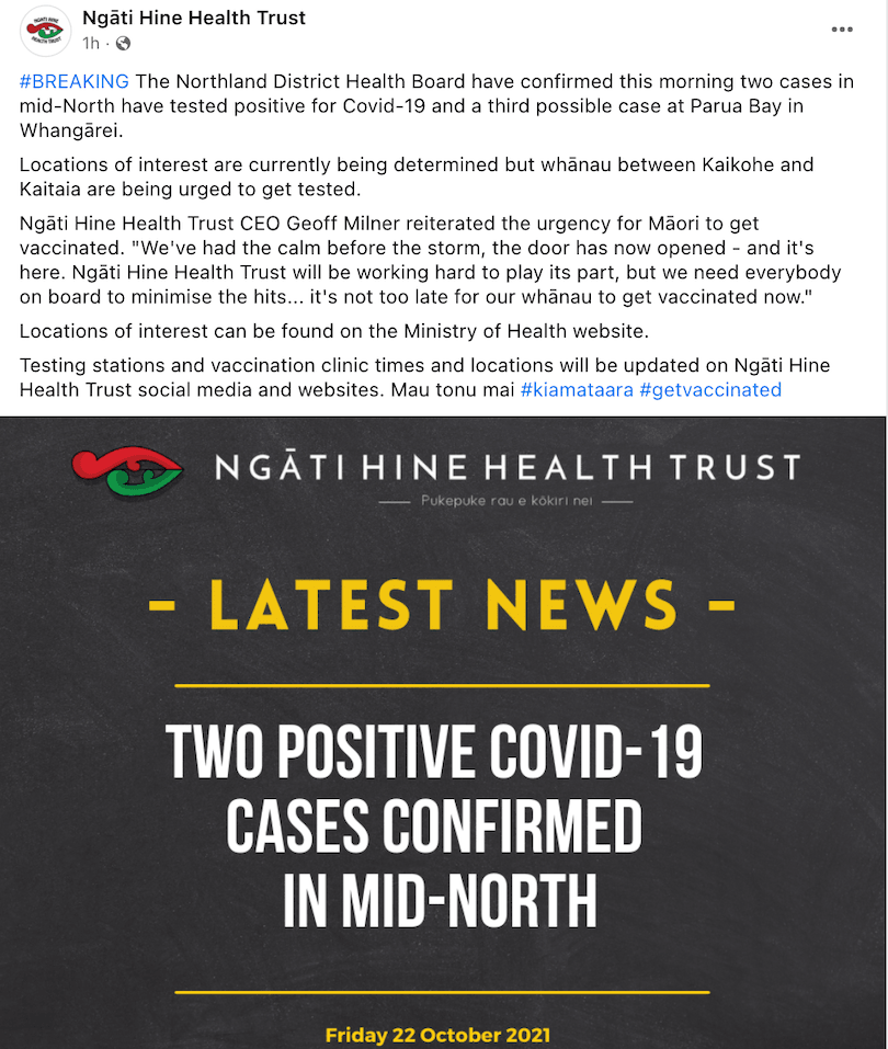 Two Covid cases have been confirmed in Northland today, according to a Facebook post from the Ngāti Hine Health Trust.