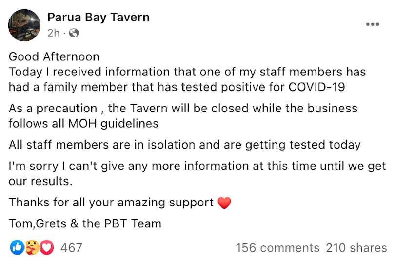 Parua Bay Tavern has posted on Facebook that a family member of one of its staff members has tested positive and it is closing as a precaution.